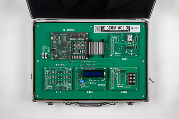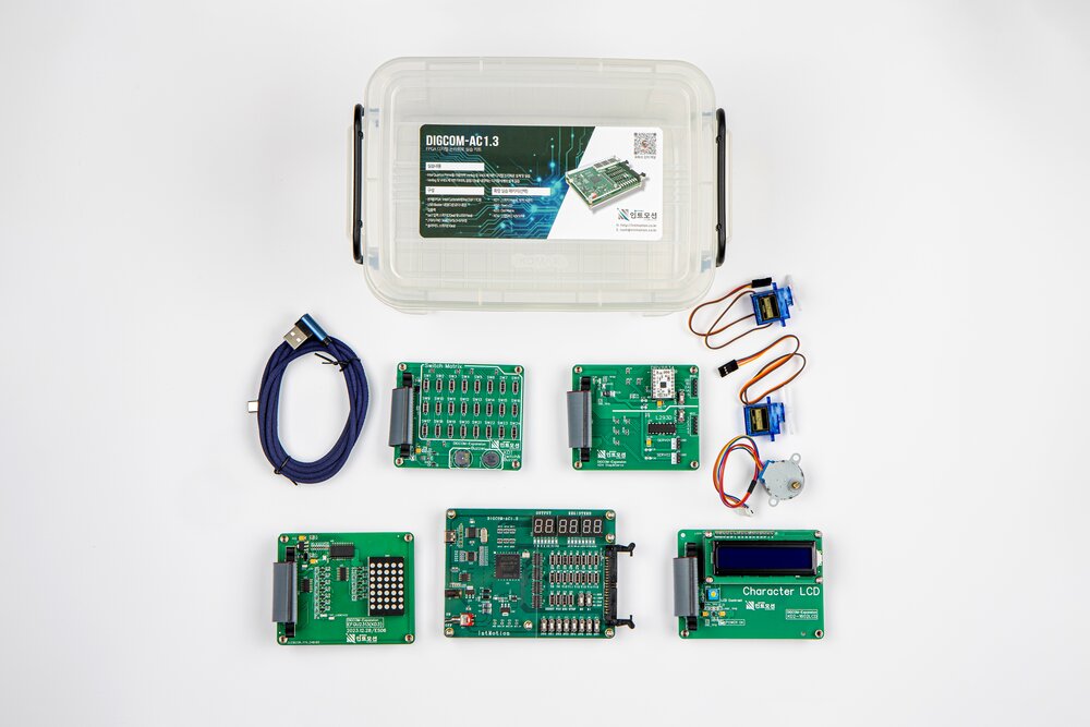 DIGCOM-AC1.3 FPGA 본체+확장 실습 키트가 플라스틱 케이스에 제공됩니다.